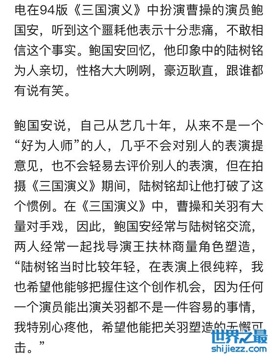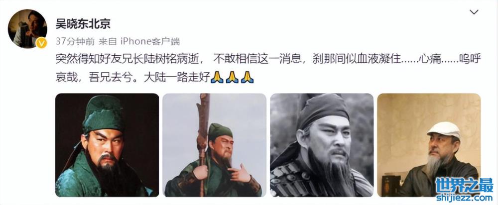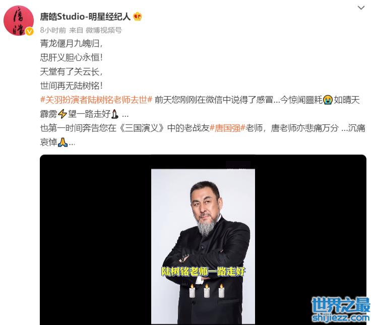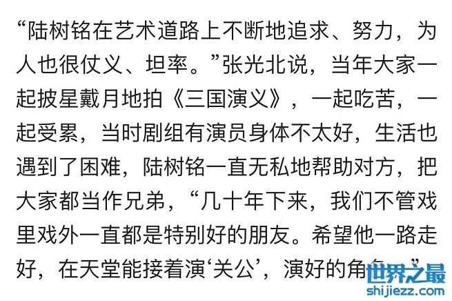 据悉,陆树铭老师早年因出演《三国演义》中的“关羽”而深入人心,后来又接拍了经典电影《大话西游》,饰演的“牛魔王”同样很成功,他生前拍摄的最后一部电影《青龙偃月刀》再次饰演一代名将“关羽”,最后一次登台表演是在今年6月,在《萌探》的舞台上,他又一次以“关羽”的形象站在观众面前。