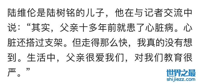 如此说来,陆树铭突发心脏病时身体情况并不好,而他儿子在接受采访时透露,陆树铭十多年前就患了心脏病,还搭过支架,去世的前一天下午两人还通了电话,安排新戏拍摄的事情,但没想到走得那么快。