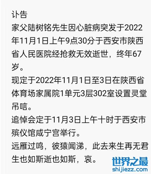目前,陆树铭的儿子已经在家中为父亲设灵,吊唁时间定于11月1日至3日,追悼会定于11月3日上午10点在西安殡仪馆举行。希望他能够一路走好,在另一个世界里不再生病遭罪,继续快乐演戏。