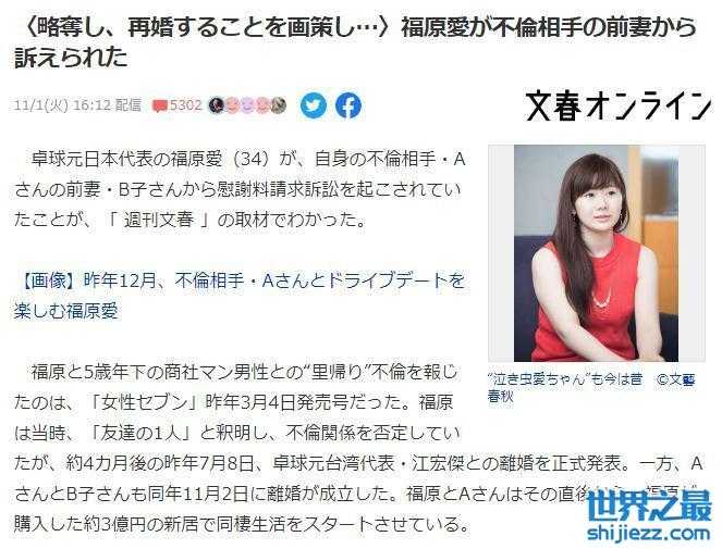 11月1日,《周刊文春》的头版上面写着:横滨男大谷翔平的前妻不满福原爱的介入,导致了前夫与自己感情的破裂,身心遭到严重的打击,目前已公开大谷翔平与福原爱相恋交往期间的书信内容。