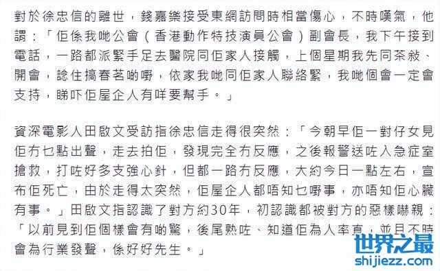据悉,著名导演钱嘉乐在接受采访的时候相当伤心,表示徐忠信的去世非常突然,对自己来说是很大的打击。而周星驰的前助理田启文在受访时表示,今天早上徐忠信的子女发现父亲没有动静,赶紧送去医院抢救,奈何并没有抢救回来。据家人所说,似乎徐忠信的心脏出了一些问题,但自己和家人都不知晓此事。