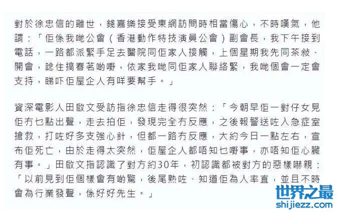 而另一位演员钱嘉乐也短暂接受了记者采访,他看起来很是难过,期间多次叹气,他说上周自己还和徐忠信一起饮茶聊天,商讨香港动作特技演员工会办春茗的事情。
