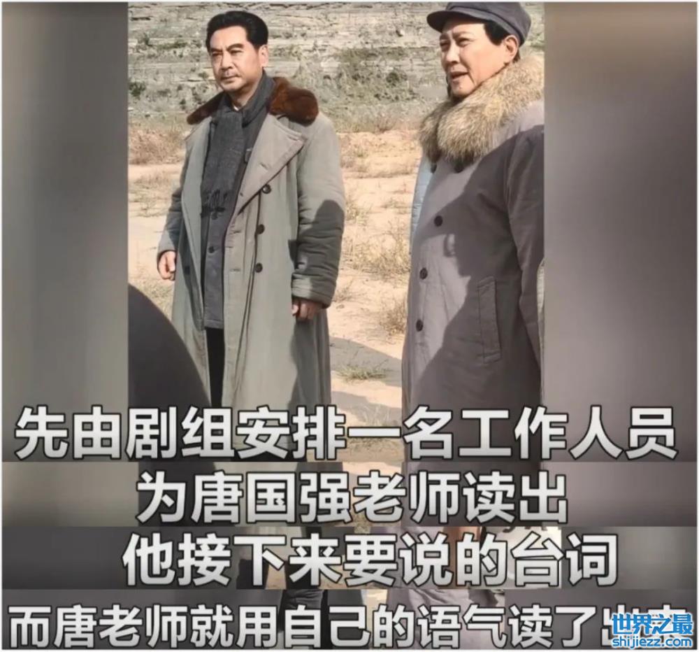 唐国强在拍《建国大业》时,带观众领略了什么叫“真人提词器”。剧组专门为他安排了一位工作人员,在镜头外念出他的下一句台词,唐国强紧接着就跟着照模照样地念下去,完全就是“复读机”状态。