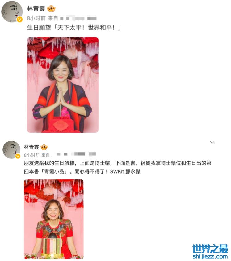 另一张图前的蛋糕则有不同的意义,这张图的蛋糕上面是博士帽,下面是几本书,由林青霞的老朋友精心设计送给她的,林青霞配文道:“朋友送给我的生日蛋糕,上面是博士帽,下面是书,祝贺我拿博士学位和生日出的第四本书《青霞小品》。开心得不得了!”从这句话可以看出林青霞激动的心情,并且她已经拿到了博士学位,可以说是收获满满。