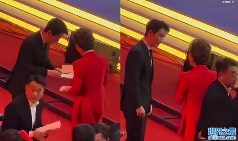 只见一开始,一身红衣的海霞单手拿着本子和笔,小心翼翼地跨过座位,往坐在前排的朱一龙走去,找到朱一龙后便附身弯腰,轻声说话向朱一龙询问签名。