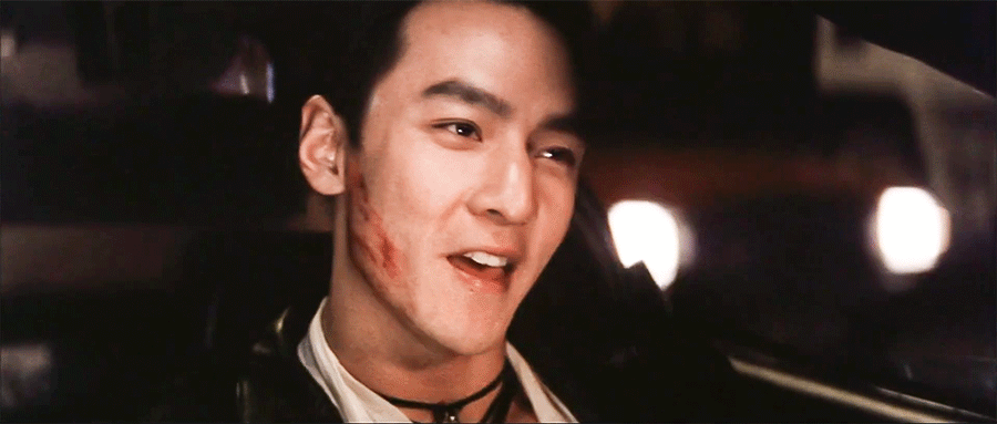 即使是短发造型,吴彦祖看着也是凶狠中透着丑陋,脸上还有不少疤痕、皱纹横生,完全看不出他原本的俊朗帅气。