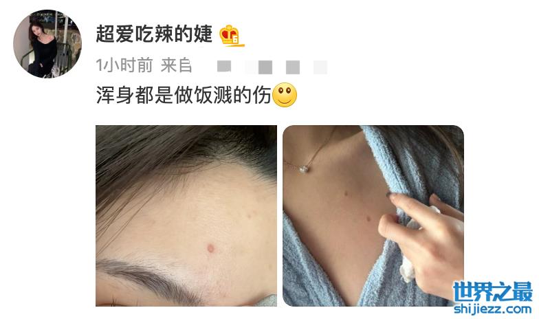 近日,王思聪女友慎婕在社交平台上晒出自己做饭被油烫到的图片,并配文:“浑身都是做饭溅的伤。”