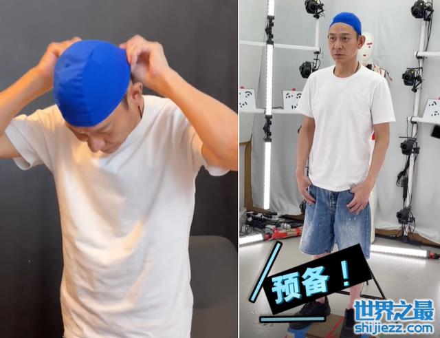 在脸上做好标记后,刘德华戴上一顶“小蓝帽”把自己的头发全部包裹住,看起来很是可爱。随后他在技术老师的指引下走到指定位置站立,只见他双手的肌肉线条明显,还有一些青筋突出。