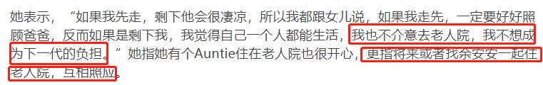去年在采访中她已经提到,她比较担心自己的丈夫方平,如果她先走了,希望女儿可以照顾丈夫方平,但如果只剩她一个人,她一个人也能生活得很好。她还透露自己打算以后和余安安约着去养老院住,不想成为下一代的负担。