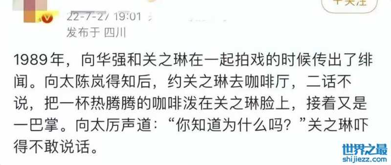 据爆料者所言,1989年向华强和关之琳曾一起拍戏,还传出过绯闻。这件事被向太得知后,她二话不说就将热咖啡泼在了关之琳的脸上,接着还扇了一巴掌。