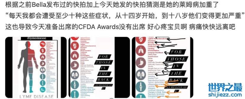 正是因为贝拉没有正式回应继而引发了部分网友的猜测,有的网友认为可能是因为她的莱姆病加重了,莱姆病是一种人畜共患的传染病,主要传染途径是蜱虫叮咬吸血,会出现游走性红斑。