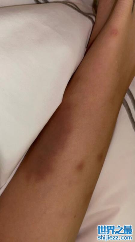第一张照片只见贝拉身形消瘦,好像浑身无力,她弯腰勾着身子坐在病床上,右手撑在床上,还有一个绿色的带子裹在手臂关节处,背部上突出的骨头和大面积的膏药贴引人侧目,除了这张照片发的另一张照片则是她笔直的长腿上遍布了大块的淤青,看起来甚是吓人。