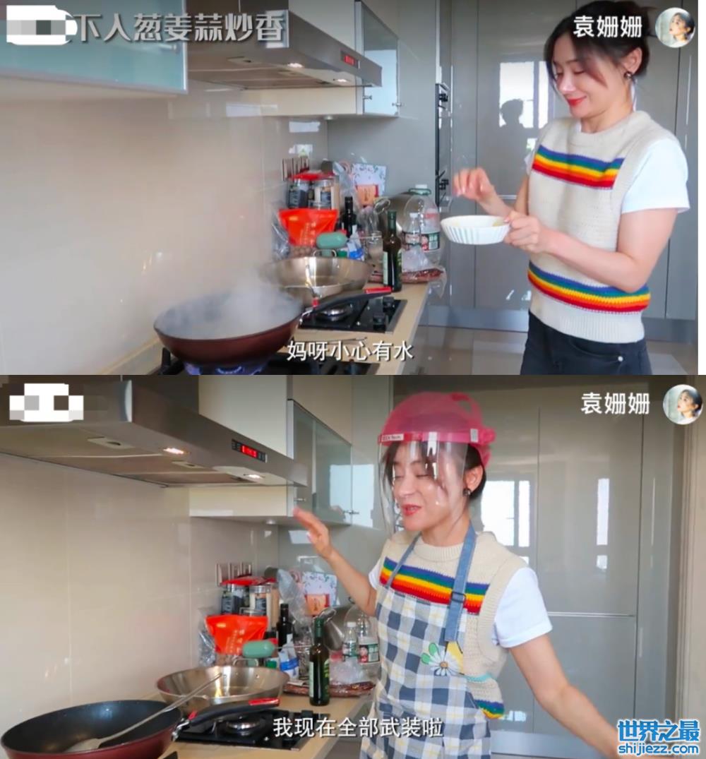 搞笑的是,在正式做菜的时候,袁姗姗表现十分喜感,当锅里溅水时直接退后浑身紧绷,后来立刻拿出她的做菜神器“塑料面具”,完全规避了被热油溅到脸的风险。袁姗姗还在视频中对着镜头兴奋表达“我现在不怕了,我全副武装了。”