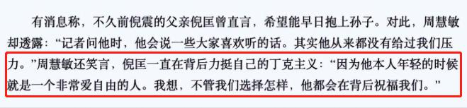 周慧敏和倪震是丁克族,相比起倪震来说,周慧敏承担了更多的压力,但倪匡一直在背后力挺她。