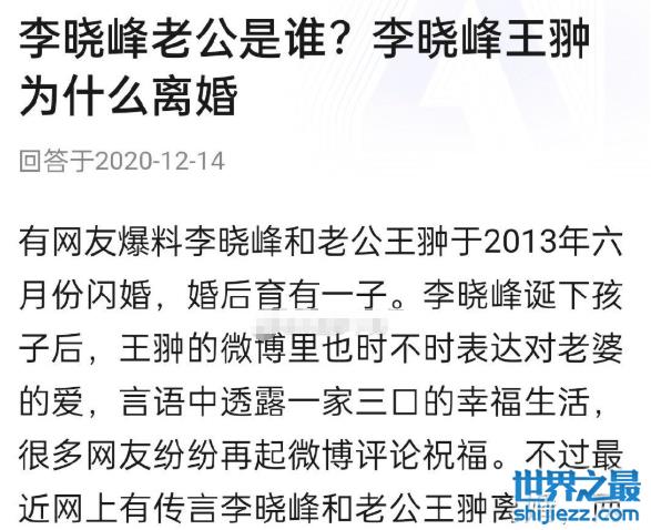 不过,有网友爆料说李晓峰此前曾结过婚,前夫名叫王翀,有一个儿子, 但在公开信息上没显示她已婚,所以无法判断真假。
