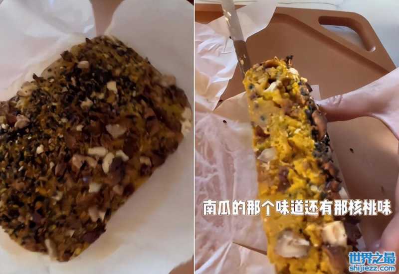 虽然刚出炉的南瓜饼看起来表面有点发黑,卖相似乎不是很好,不过拿刀切开之后看起来内里金黄还很很多颗粒,饱满又丰富。谢娜也是切下来一块自己品尝,据她的形容,吃起来非常香甜。