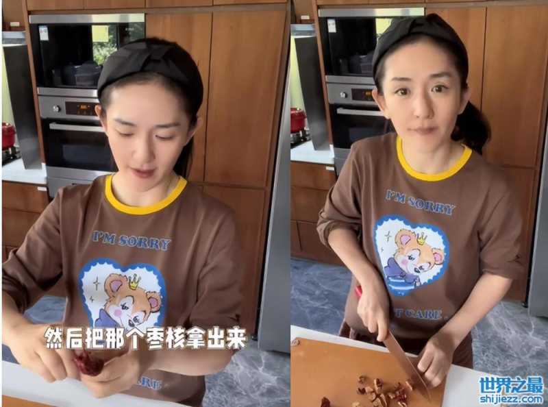 在烤制南瓜的过程中,谢娜赶紧来把红枣的枣核除去,用刀把红枣切碎,不得不说谢娜这架势一看就是经常做饭,刀功相当了得,还能时不时看一看镜头,也不会把手切到。