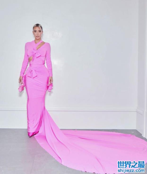 可以看到这件礼服的胸前和腰部都以系结的方式呈现出来,从左肩到右处的腰部以一条线的方式露出来,外加芭比粉的色彩搭配,显得十分抓眼,可以说除了卡戴珊没有第二个能hold住这件浮夸色彩的紧身礼服了。