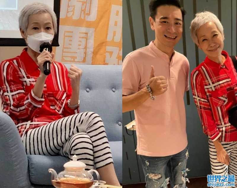 照片中的叶童穿着白色短T搭配一件黑色西装外套,黄色豹纹长裤下的双腿十分纤瘦。头发白的叶童脸上也有了岁月的痕迹,面容消瘦眼角皱纹明显,而说起话来精神气十足。