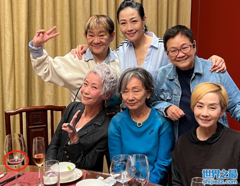 已经59岁的叶童在这次聚会似乎有点激动,桌上一杯红酒见底,面色上两团红晕十分显眼。与一众好友合影时,叶童比其他合影显得要高兴许多,身子微微靠向好友,左手向前比耶,脸上笑容不断。