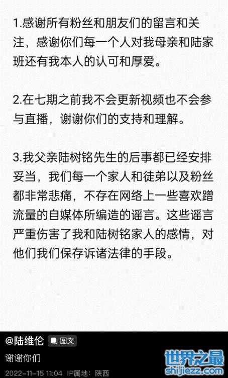 11月15日,继父亲陆树铭去世之后,其儿子陆维伦首度更新动态,以白纸黑字的方式对外发布8点声明,文中,陆维伦先是对近期关心自己与家人的粉丝表达由衷感谢,其中还提到了父亲生前一手创办的“陆家班”。