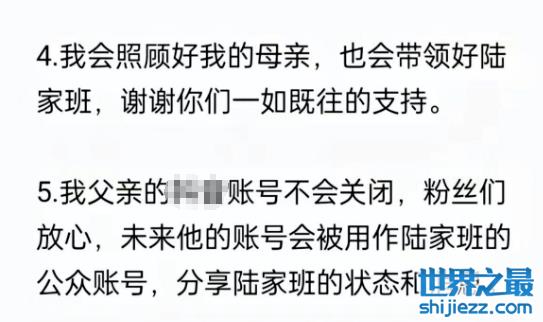 陆维伦在文中还透露,父亲陆树铭的账号也不会关闭,未来这个账号会成为陆家班的公众账号,用以分享陆家班的状态与消息。