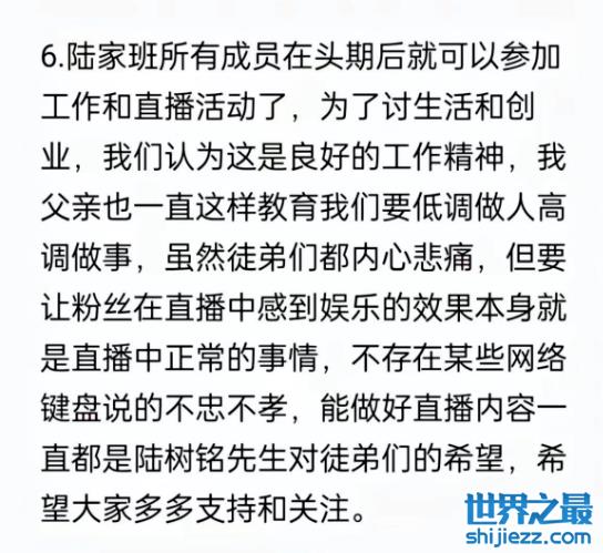 而所有陆家班的成员也会在头期之后恢复原本的工作,毕竟大家每个人要为了生活而奋斗,在此,陆伟伦也特别解释到陆家班成员开直播也是正常的工作需要,在直播过程中也会刻意营造娱乐效果,并非有些网友认为的那样强蹭热度,不忠不孝,这一点不应该遭到大家的曲解,而且做好直播内容也是父亲一直以来对徒弟们的期望,相信在天之灵的父亲也会全力支持大家的工作。