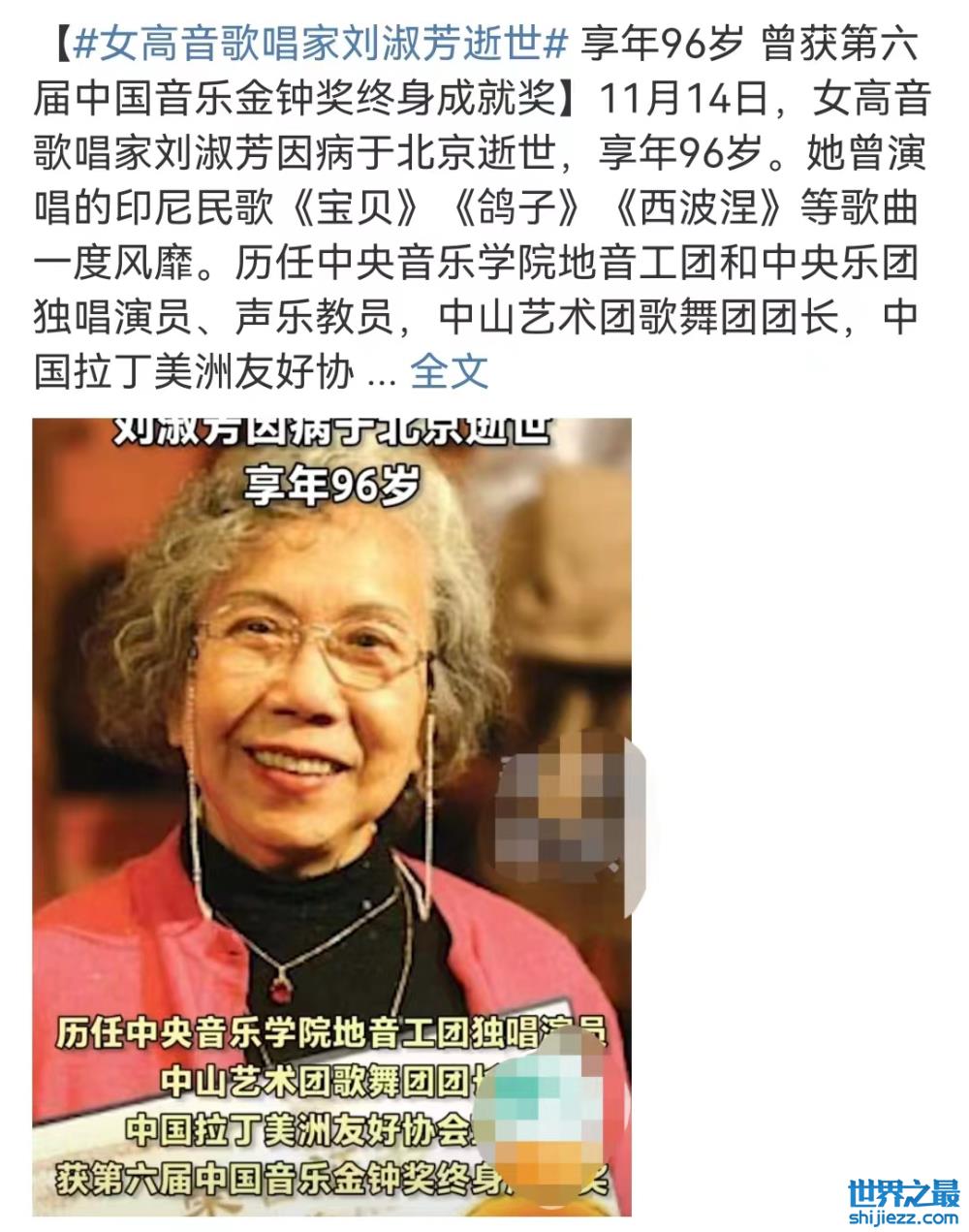 11月16日有消息称女高音歌唱家、国家一级演员刘淑芳女士逝世,后来得到证实,刘淑芳女士在11月14日因病去世,她曾演唱的《宝贝》、《西波涅》、《鸽子》等歌曲,一度风靡全国,深受各国人民喜爱。