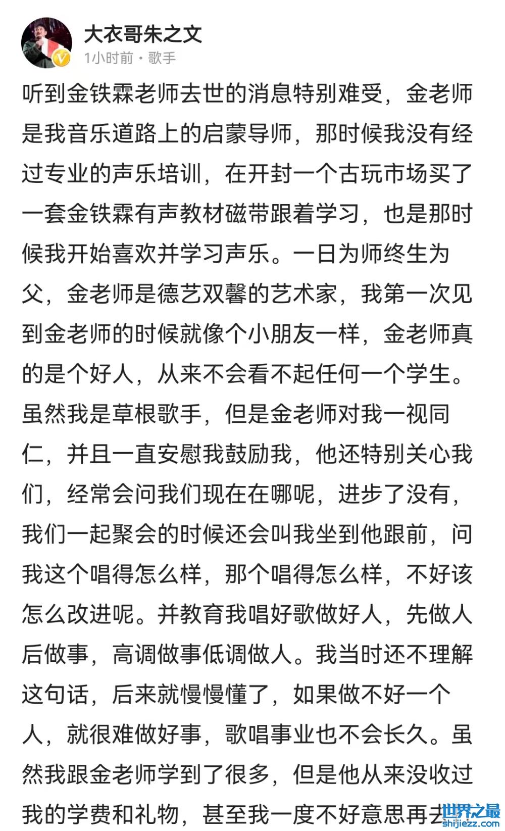而众星也都纷纷发文怀念金铁霖老艺术家,大衣哥还发长文回忆了和金铁霖老艺术家的相处,字里行间充满了不舍的情绪。