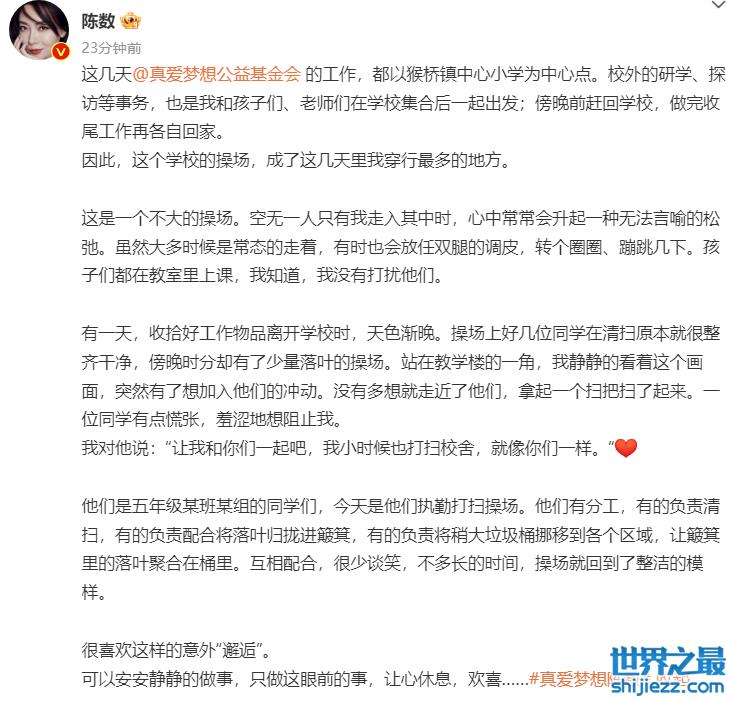 最近一段时间,陈数一直和自己的公益基金团队成员在农村小学中参加公益活动,不同于一些大众认知中的明星公益就是鼓励大家捐款,带头捐款捐物,陈数做公益的方式则是和大家一起全程参与其中亲力亲为地去帮助这些有需要的孩子们。