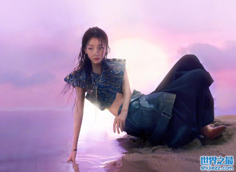 周冬雨躺沙地上拍性感照,穿露脐装身材骨感,披一头湿发半跪在地 ...