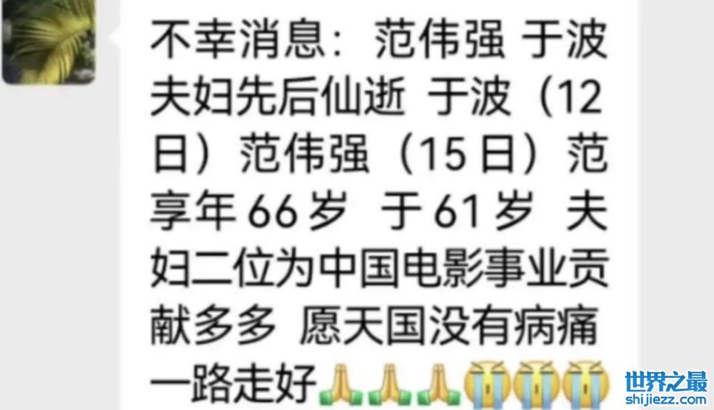 更加令人感到痛心的是,范伟强的妻子于波也因为肺癌最终于11月12日不治离世,夫妻二人一前一后离去。范伟强离世是因为突发高烧并发肺炎感染,疑似因为妻子的离开打击太大,从而一蹶不振,精神不佳的情况下身体也受到了沉重的打击。