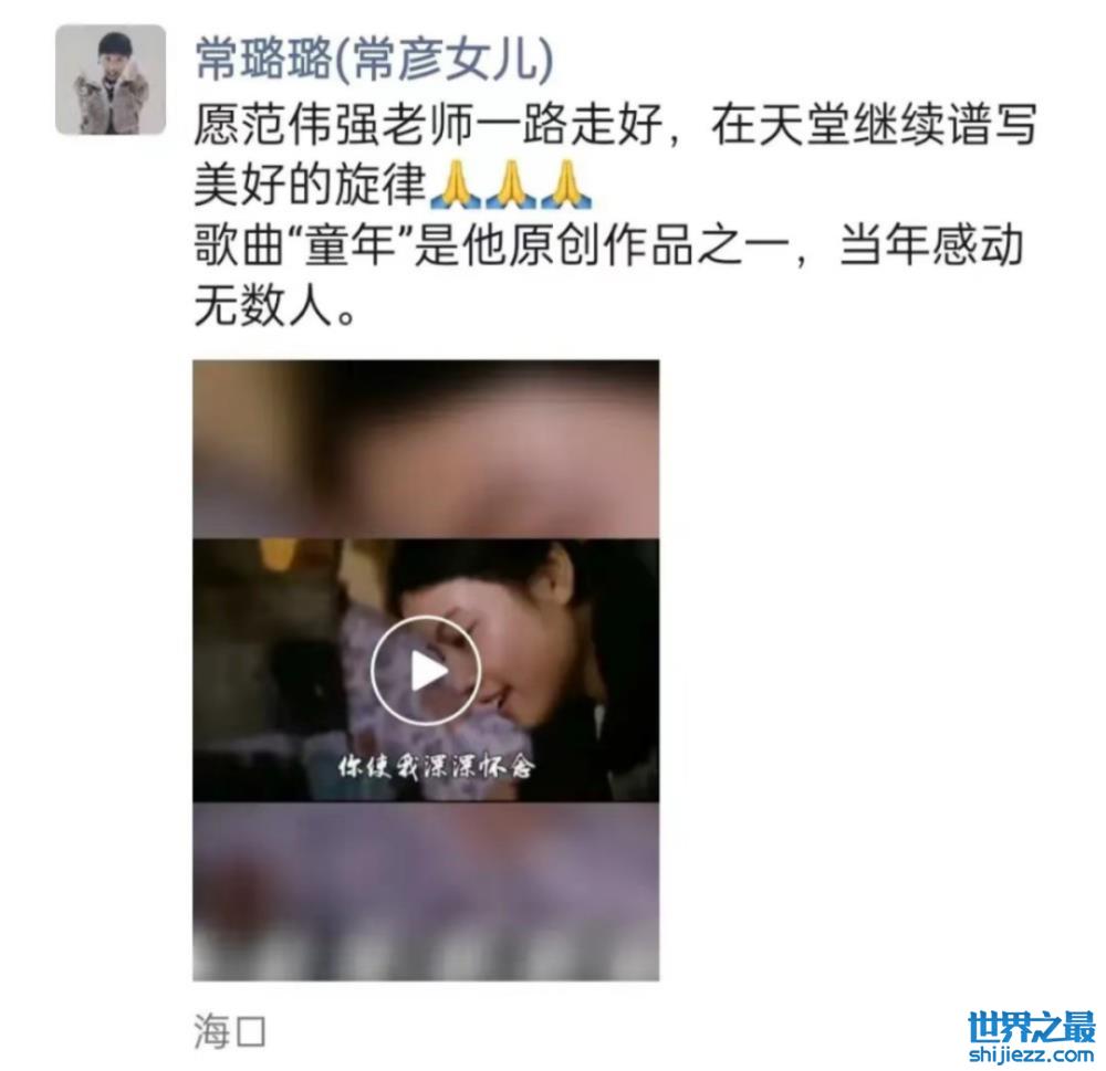 近日,范伟强好友导演常彦的女儿常璐璐,在其社交平台上痛惜范伟强的离世。据闻其于11月15号因病去世,生命永远定格在66岁。