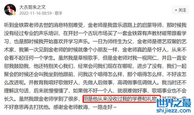 我们熟悉的草根歌手大衣哥也发文表达了对金铁霖的怀念之情,他回忆起两人的相见,金老师对任何学生都一视同仁,经常关心大家的歌唱水平是否有进步,教育他“唱好歌先做人”。