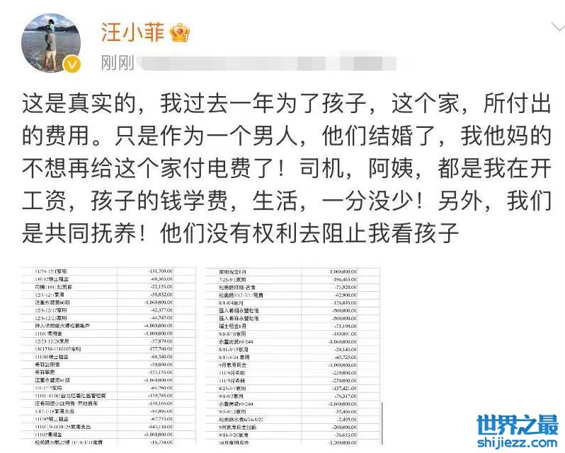 随后,汪小菲又发了一条新动态,还晒出了一年来的费用清单,并表示作为一个男人,自己不想再为这个老婆的二婚家庭付电费了。