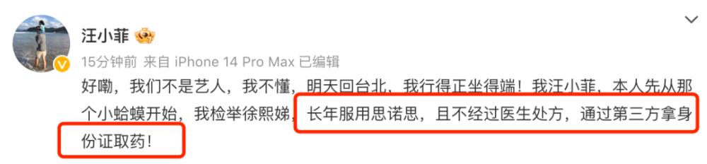 很快,汪小菲就真的听了妈妈的话,在微博实名举报小S,并称她长期服用思诺思,还不经过医生处方,通过第三方拿身份证取药。