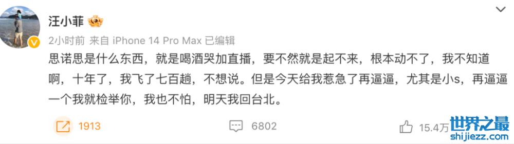 汪小菲还在微博提到,此前小S总是在网上发一些莫名其妙的视频,疑似是喝醉酒之后胡言乱语。