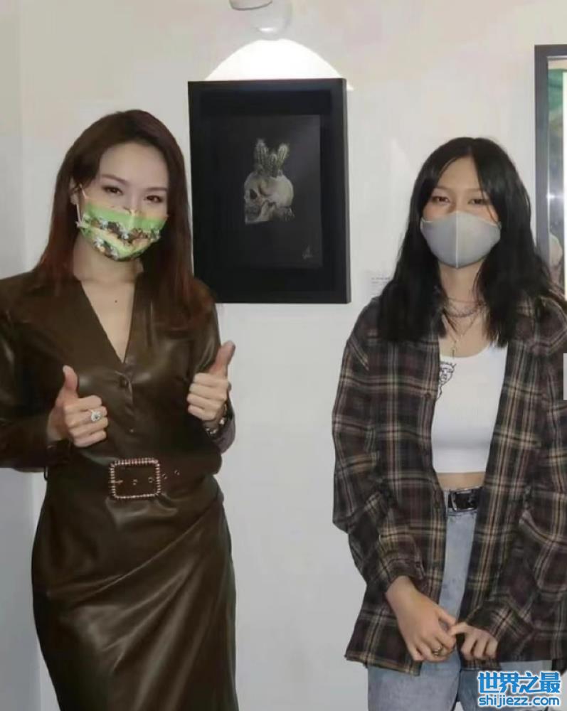 两位创作者还特意站在作品前合照留念,17岁的张瑶萱个子高挑纤瘦,穿着露脐装牛仔裤站在一旁模样乖巧的同时也不失自我个性,长相尤其是眉眼的部分,看起来跟爸爸张学友极其相似。