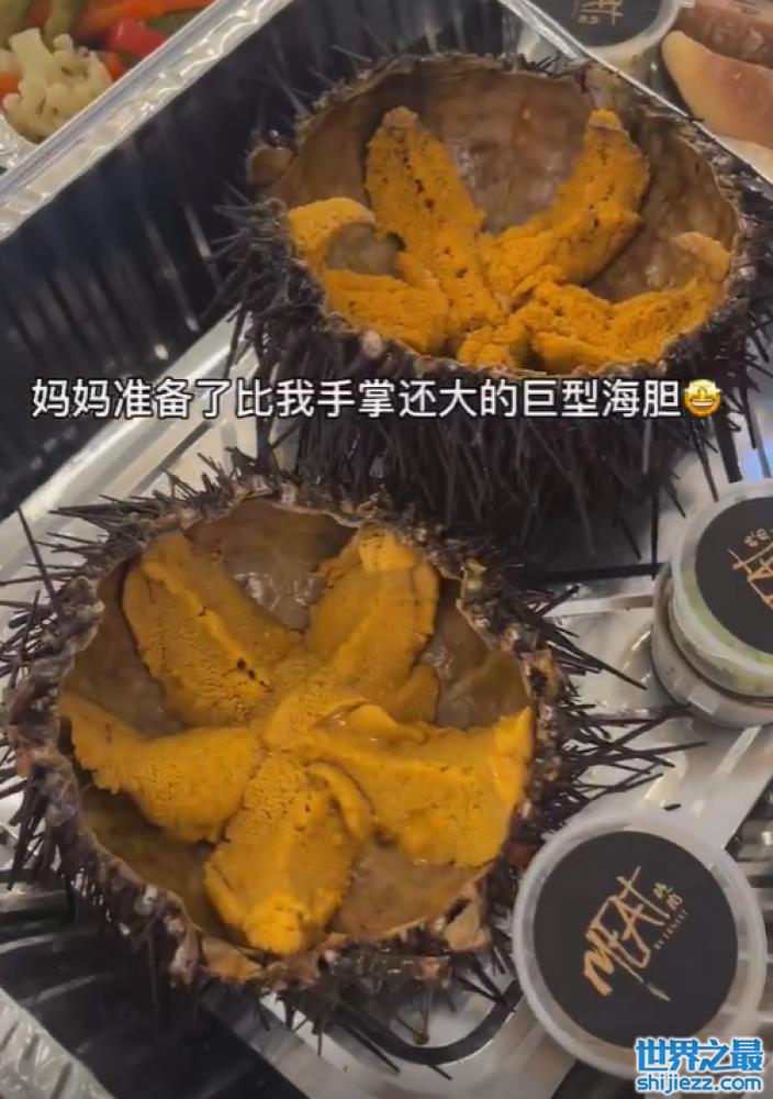 桌上最抢眼的大概就是中央那一大盆的海胆,用晚晚本人的话来说就是“比我的手掌还要大的巨型海胆”, 镜头中的画面看起来也是的确如此。