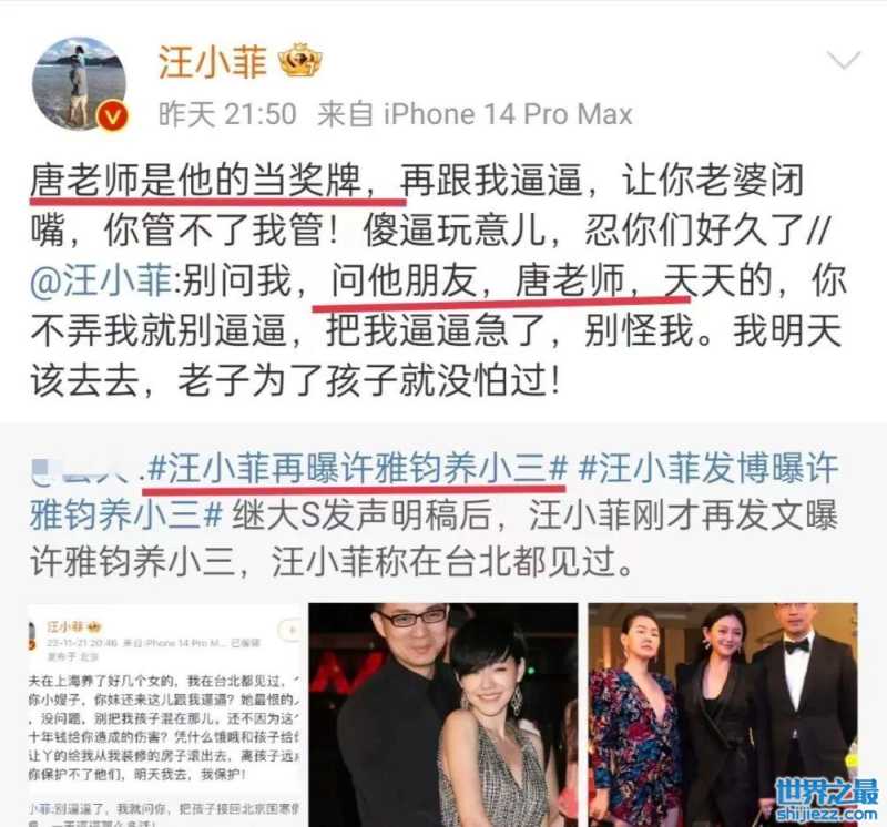 这还没完,汪小菲还透露小S老公许雅钧在上海养小三,养了几个女生,他在台北都见过。让小S他们离孩子远点,控诉大S保护不了孩子,他去保护。