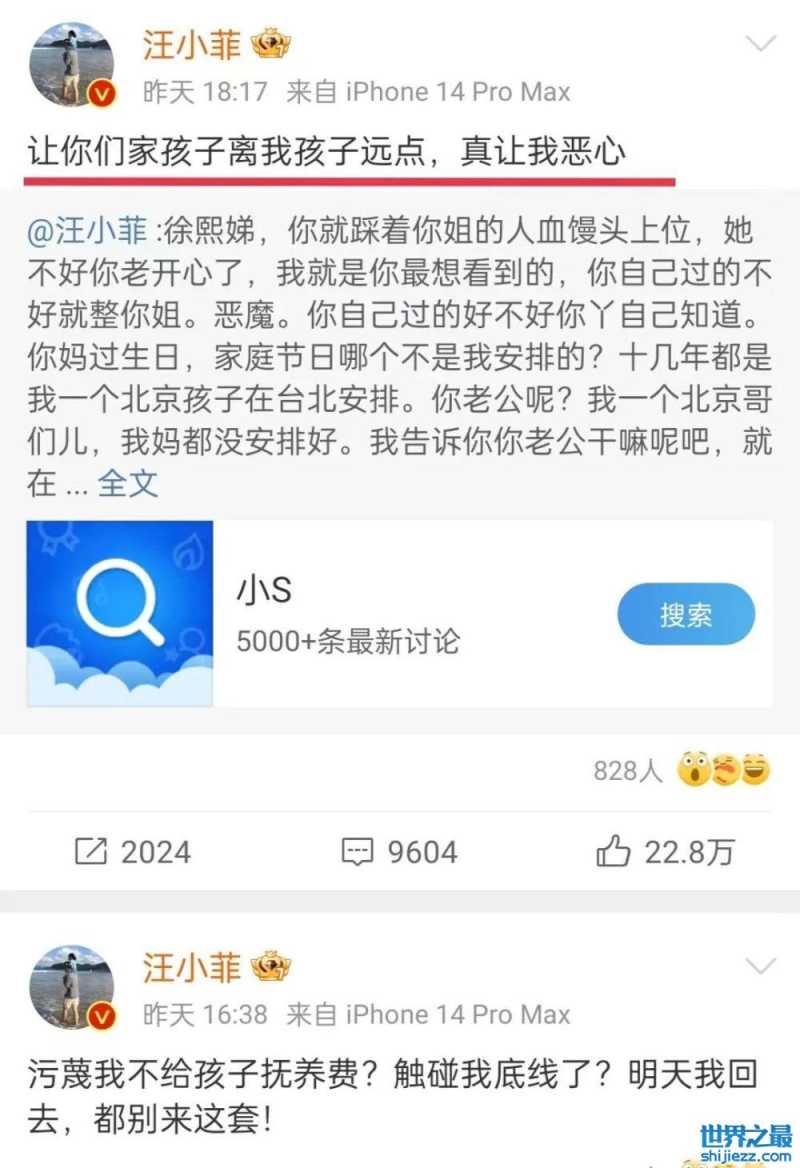 对小S的怨气实在太深,汪小菲连她家小孩一并吐槽,称都让他恶心。还让小S家的孩子,离他的孩子远点。不管大人之间有什么恩怨,拿孩子出气,真的没必要。别的不说,汪小菲责怪小S孩子的事情,受到了一些网友的指责。