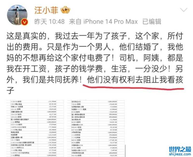 接着,汪小菲晒出了账单,称过去一年为了孩子和家庭,他付出了太多,并说明孩子是共同抚养,指控大S阻止他看孩子,也许是觉得口说无凭,汪小菲晒出了账单费用,以此来证明自己所言为真。
