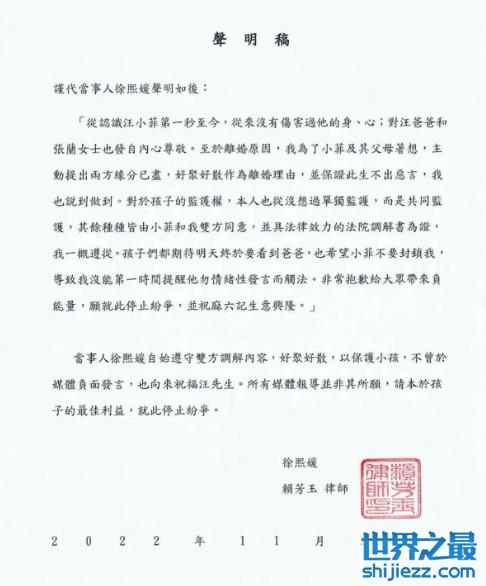 声明简洁明了,说跟汪小菲好聚好散,尊重前婆婆公公,并且自己从未独占抚养权,你说明天要来台湾,欢迎,孩子们也很期待。