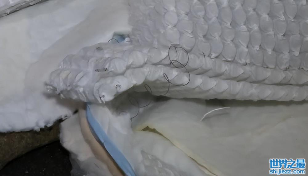 现场被【大卸八块】的昂贵床垫被彻底破坏损毁,里面原本的构造都在镜头下被完全曝光,甚至连弹簧都被工作人员给拆卸了出来。