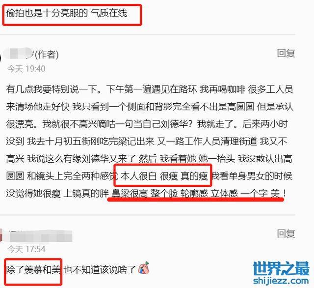 很多网友们对于楼主的偶遇表示羡慕,有人表示即便是这种偷拍视角,高圆圆的颜值依旧能打,在人群之中十分亮眼。楼主也没忍住自己的分享欲望,接着在评论区细数两次相遇的细节,表示自己第一次根本不敢认,第二次才认出来是高本人,整个脸非常立体,又高又瘦又白。
