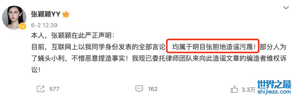 有自称张颖颖的同学爆料她靠他人上了北电进修班,后来通过怀孕、流产的方式获得一笔赔偿,后来还以近乎同样的方式套路了汪小菲,因此获得房子和车子。但张颖颖也立刻发文回击,称对方是明目长大的造谣,已经找了律师维权,所以大家理性吃瓜,切勿造谣。