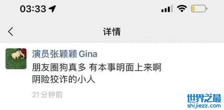 随后,张颖颖似乎又在自己那条朋友圈下方评论,内涵自己的朋友圈里面“狗”真多,都是阴险狡诈的小人,更是直接喊话“有本事明面上来”。想必是收到了什么不好的评论,让张颖颖直接愤怒。