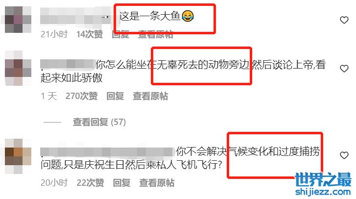 不过对于这巨大的鱼头,网友们的评价则是完全不一样。有人还在评论区感叹这个鱼头之大,令人惊叹。但有网友开始指责比伯,表示无法理解他为何能够坐在无辜死去的动物旁边谈笑风生,更有人直接批评比伯不够环保,不关注气候变化和过度捕捞的问题。