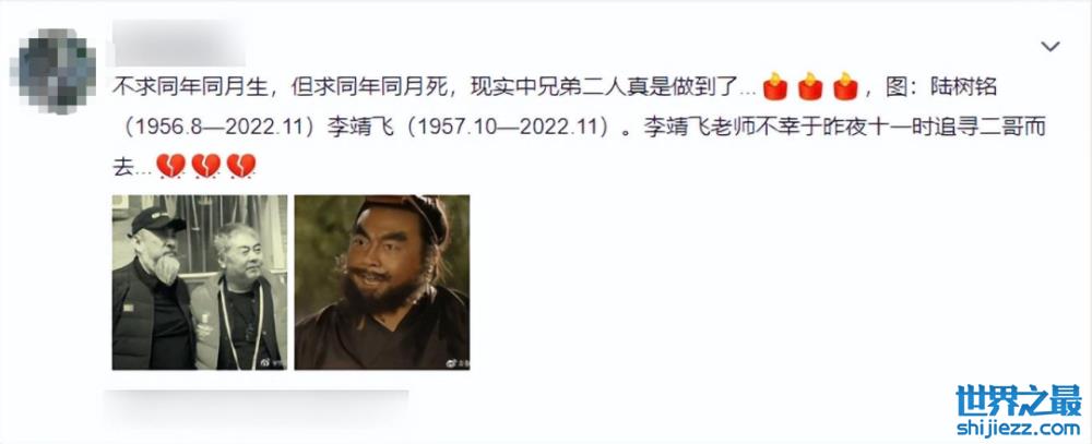 有网友说现实中的两兄弟做到了“不求同年同月生,但求同年同月离开”。陆树铭老师在11月初离开,而李靖飞老师在十一月尾追寻二哥而去。