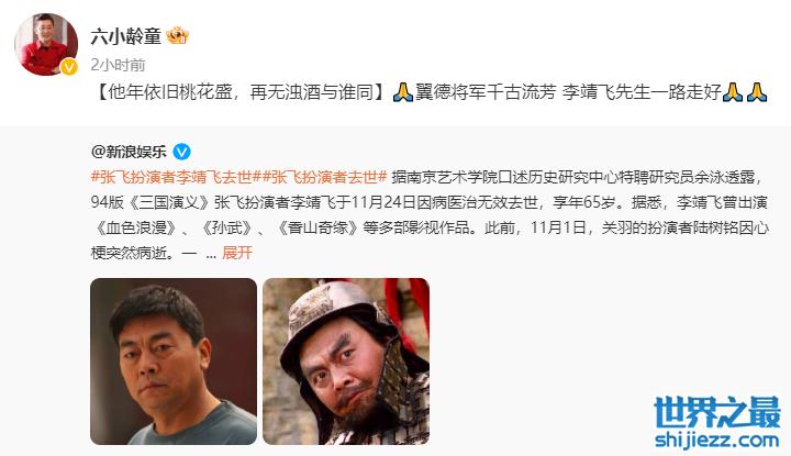 听闻李靖飞去世的消息,业内许多知名演员也纷纷发文予以悼念,其中包括一同出演《三国演义》的老搭档唐国强与刘彦君,此外演员六小龄童也特意发文予以缅怀。